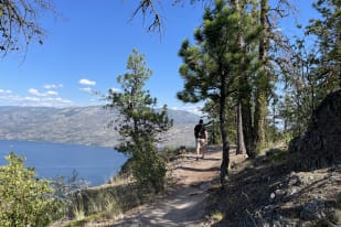 The area features a mix of single and dual-track trails, a stocked lake (Spring Lake, with 500 rainbow trout added annually), and a stunning lookout point with sweeping views over Okanagan Lake.